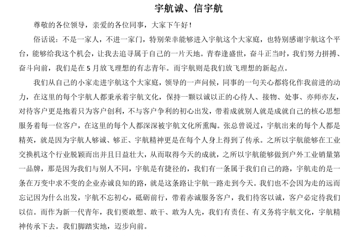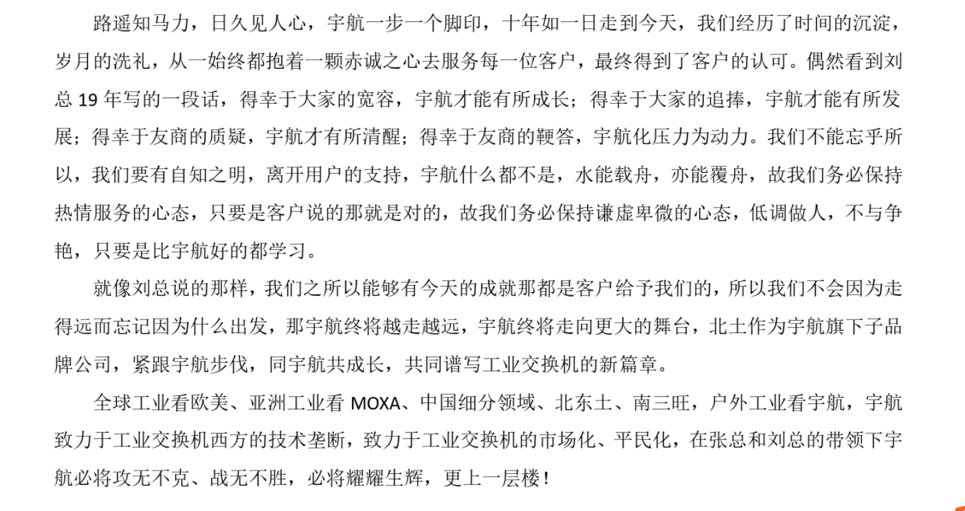 近期,宇航工業(yè)交換機在全國各地的展會正如火如荼地進行,因此,有幾個同事因參展未能參加此次比賽。其中,宇航工業(yè)交換機旗下子公司子品牌北土工業(yè)參賽選手“孫全龍”的演講稿,被評為最佳演講稿。宇航工業(yè)交換機總設計師張總對此演講稿給予了高度的肯定,也向在座所有人傳遞了主動、激情、真誠、用心”的做事態(tài)度。
