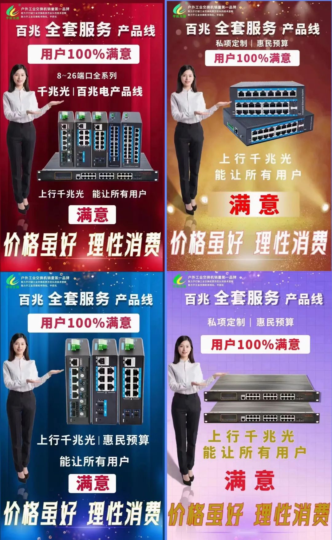 宇航工業交換機立足工業領域帶寬小,性能要求高,為了解決價格壓力大市場痛點,宇航工業交換機推出全系列2層管理全套服務千兆光百兆電產品線!私項定制、惠民預算,能滿足100%工業領域小帶寬市場要求。同時,也讓用戶100%滿意!