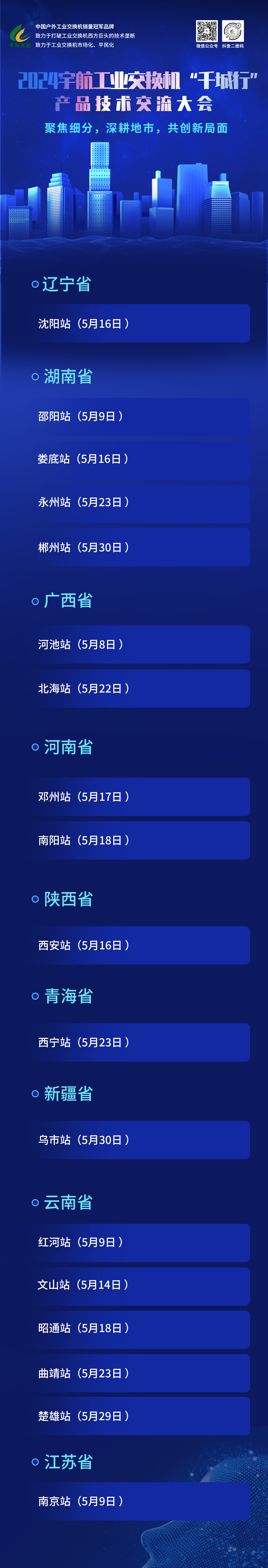 自宇航推出全國產工業交換機以來,就憑借其卓越的性能和可靠的質量,在各個行業領域取得了顯著的成績,贏得了業界的廣泛贊譽。為了與各位友商及客戶深入交流,把握市場新機遇,宇航誠摯地邀請您參加五月份在重慶、鄭州、安徽、成都、新疆、濟南等地的工業交換機相關的展會,以及在江蘇、湖南、廣西、云南、河南、陜西、青海、新疆、遼寧等城市舉辦的2024宇航工業交換機千城行產品技術交流大會。
