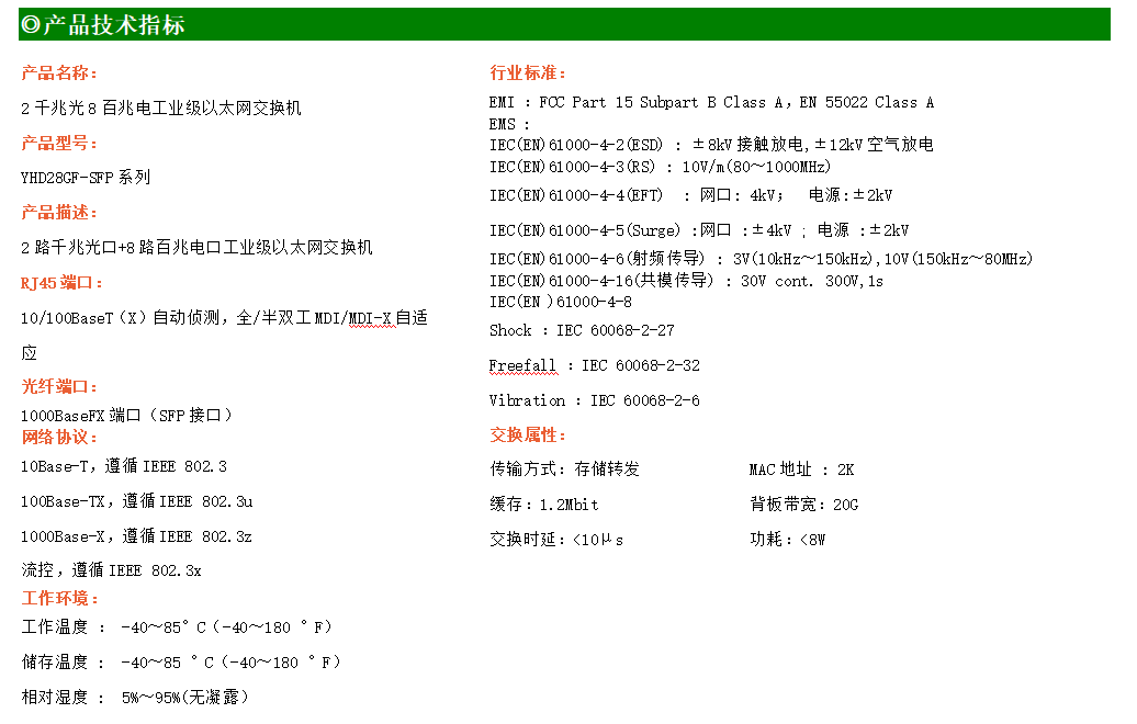 YH300-28GF-SFP工業(yè)級以太網(wǎng)交換機,支持8個10/100Base-T(X)電口和2個1000Base-X光口。產(chǎn)品符合FCC、CE、ROHS標準。YH300-28GF-SFP交換機具有-40℃~85℃的工作溫度,具有超強的堅固度能適應(yīng)各種嚴苛環(huán)境,也可以非常方便的安置在空間緊湊的控制箱中。導(dǎo)軌的安裝特性、寬溫操作及擁有IP40防護等級的外殼及LED指示燈,使YH300-28GF-SFP成為一個即插即用的工業(yè)級設(shè)備,為用戶的以太網(wǎng)設(shè)備聯(lián)網(wǎng)提供可靠、便捷的解決方案。