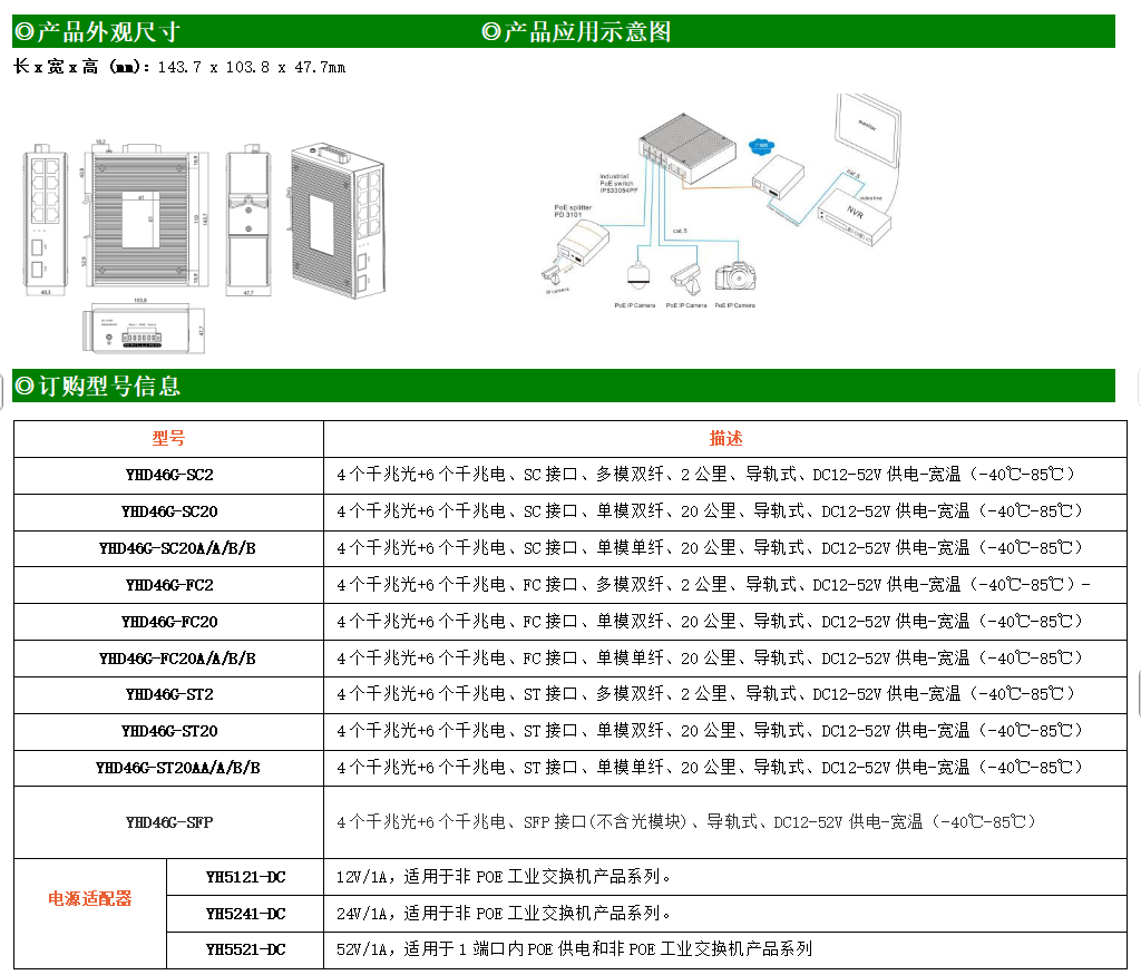 6路千兆電口+4路千兆FX光口工業級以太網交換機,支持6個100Base-T/1000Base-TX電口和4個1000Base-X光口。產品符合FCC、CE、ROHS標準。YH300-46G交換機具有-40℃~85℃的工作溫度,具有超強的堅固度能適應各種嚴苛環境,也可以非常方便的安置在空間緊湊的控制箱中。導軌的安裝特性、寬溫操作及擁有IP40防護等級的外殼及LED指示燈,使YH300-46G成為一個即插即用的工業級設備,為用戶的以太網設備聯網提供可靠、便捷的解決方案。