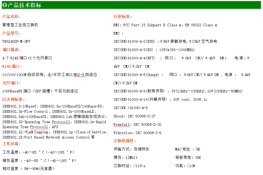 YH600-24GSP-M-SFP是網(wǎng)管型工業(yè)以太網(wǎng)POE交換機,產(chǎn)品符合FCC、CE、RoHS標準。支持2個千兆光口和4個千兆電口;支持工業(yè)現(xiàn)場所需的以太網(wǎng)二層協(xié)議,保證通信網(wǎng)絡的穩(wěn)定性;該系列交換機采用低功耗、無風扇設計,確保無噪聲干擾,同時支持-40~85℃工作溫度和良好的EMC電磁兼容性能,保證在惡劣的工業(yè)環(huán)境中保持穩(wěn)定的工作,為工廠自動化,智能交通,視頻監(jiān)控等工業(yè)應用領域組建快速穩(wěn)定的網(wǎng)絡終端接入網(wǎng)絡提供安全可靠的解決方案。