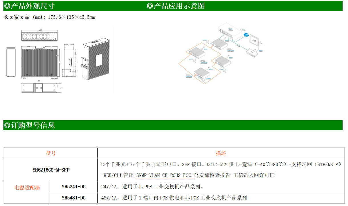 YH600-216GS-M是網管型工業以太網交換機,產品符合FCC、CE、RoHS標準。支持2個千兆光口和16個千兆電口;支持工業現場所需的以太網二層協議,保證通信網絡的穩定性;該系列交換機采用低功耗、無風扇設計,確保無噪聲干擾,同時支持-40~80℃工作溫度和良好的EMC電磁兼容性能,保證在惡劣的工業環境中保持穩定的工作,為工廠自動化,智能交通,視頻監控等工業應用領域組建快速穩定的網絡終端接入網絡提供安全可靠的解決方案。