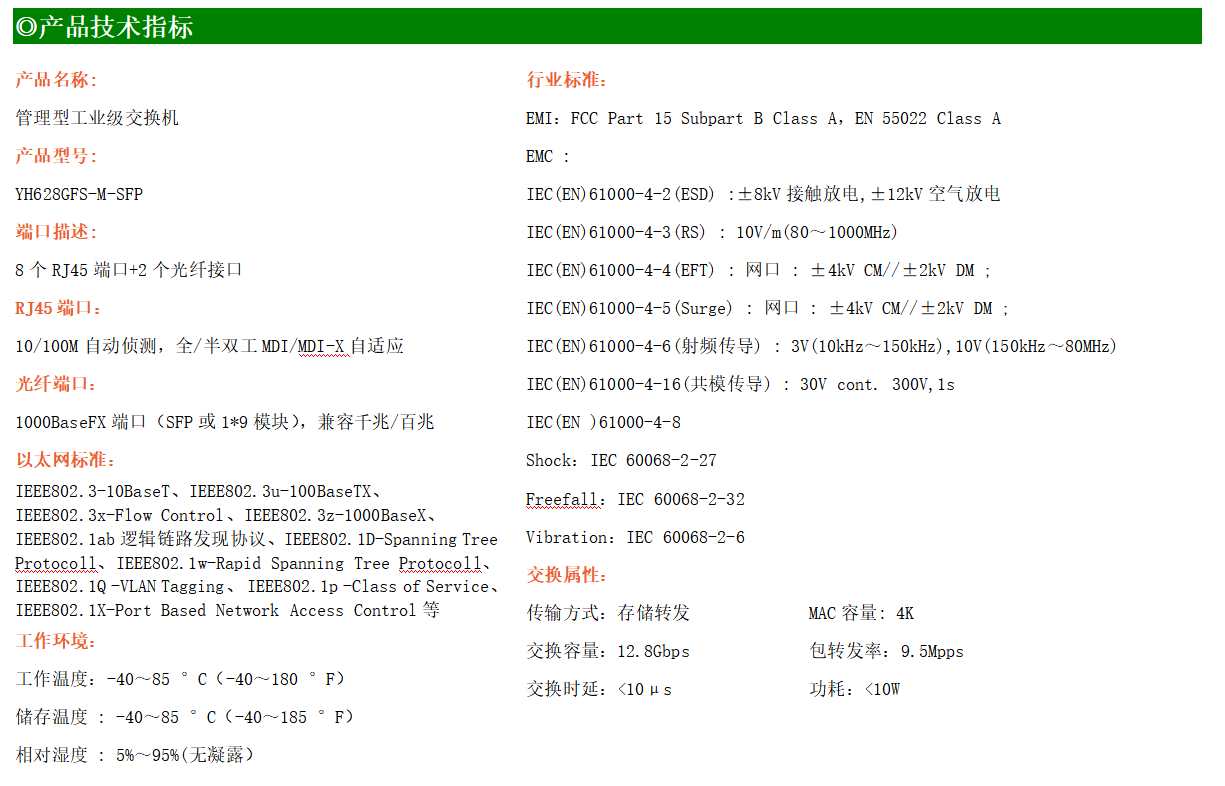 YH500-28GFS-M是網(wǎng)管型工業(yè)以太網(wǎng)交換機,產(chǎn)品符合FCC、CE、RoHS標準。支持2個千兆光口和8個百兆電口;支持工業(yè)現(xiàn)場所需的以太網(wǎng)二層協(xié)議,保證通信網(wǎng)絡的穩(wěn)定性;該系列交換機采用低功耗、無風扇設計,確保無噪聲干擾,同時支持-40~85℃工作溫度和良好的EMC電磁兼容性能,保證在惡劣的工業(yè)環(huán)境中保持穩(wěn)定的工作,為工廠自動化,智能交通,視頻監(jiān)控等工業(yè)應用領域組建快速穩(wěn)定的網(wǎng)絡終端接入網(wǎng)絡提供安全可靠的解決方案。
