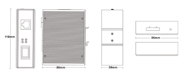 外殼:金屬材質 安裝:DIN 卡軌式,壁掛式安裝 重量:0.36Kg 尺寸 :118 x 86 x 39mm (長 x 寬 x 高) |