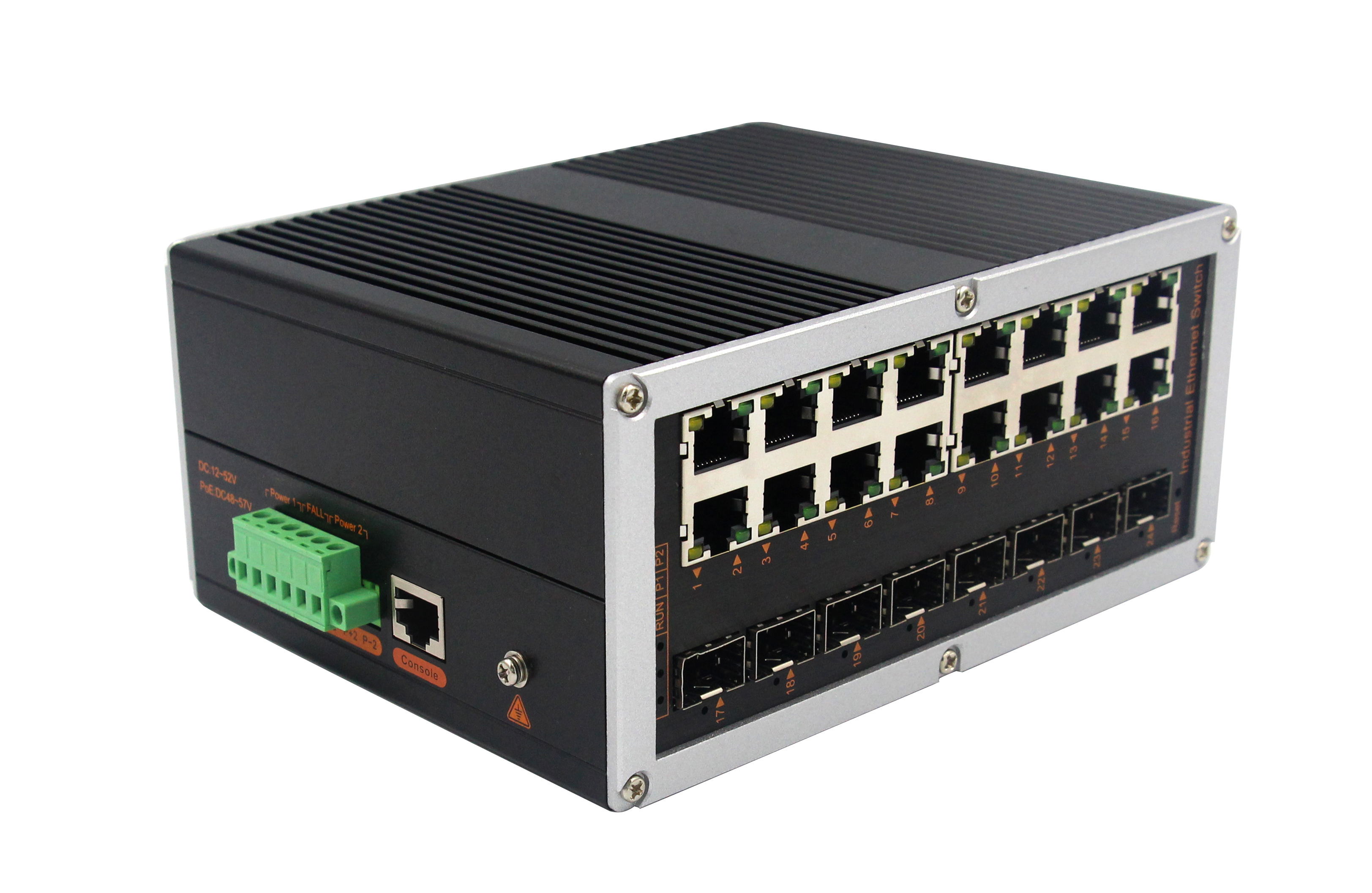 8個千兆光+16個千兆電、SFP接口(不含光模塊)、導軌式、DC12-52V供電