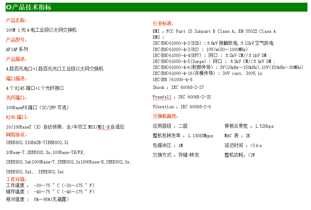 4路百兆電口+1路百兆FX光口工業級以太網交換機,支持4個10Base-T/100Base-TX電口和1個100Base-X光口。產品符合FCC、CE、ROHS標準。AF14F系列交換機具有-30℃~75℃的工作溫度,具有超強的堅固度能適應各種嚴苛環境,也可以非常方便的安置在空間緊湊的控制箱中。導軌的安裝特性、寬溫操作及擁有IP40防護等級的外殼及LED指示燈,使AF14F成為一個即插即用的工業級設備,為用戶的以太網設備聯網提供可靠、便捷的解決方案。