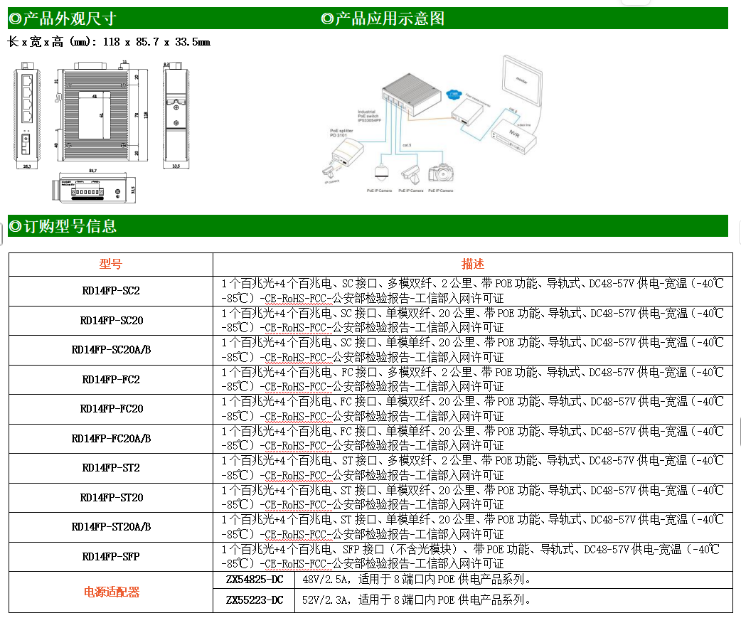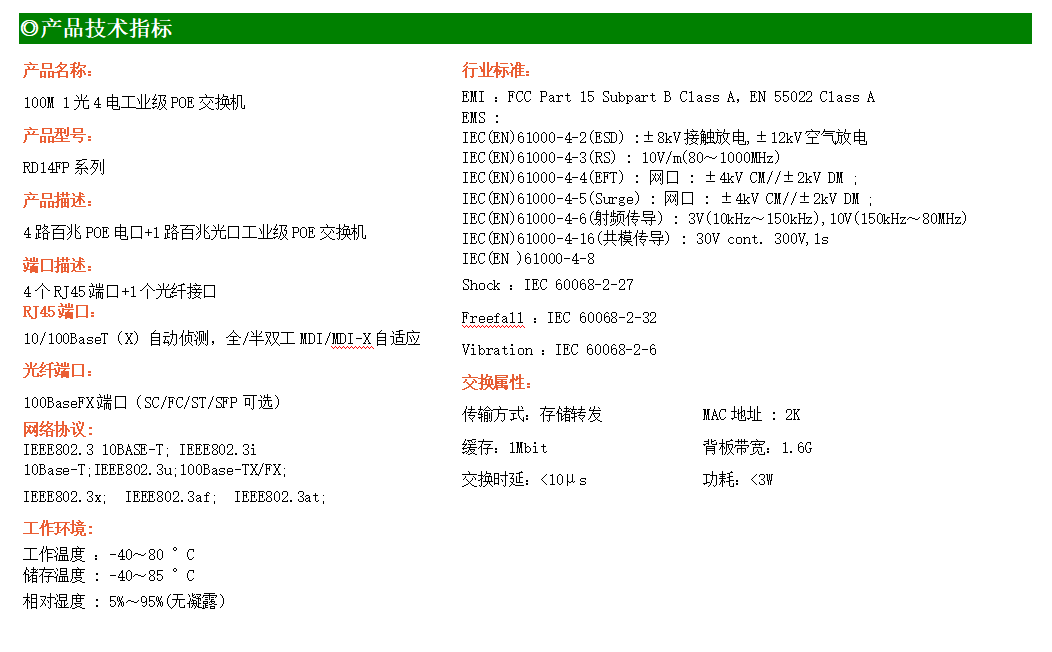 4路百兆POE電口+1路百兆SC光口工業(yè)級(jí)以太網(wǎng)POE交換機(jī),支持4個(gè)10/100Base-TX電口和1個(gè)100Base-X光口。產(chǎn)品符合FCC、CE、ROHS標(biāo)準(zhǔn)。RD14FP系列交換機(jī)具有-40℃~80℃的工作溫度,具有超強(qiáng)的堅(jiān)固度能適應(yīng)各種嚴(yán)苛環(huán)境,也可以非常方便的安置在空間緊湊的控制箱中。導(dǎo)軌的安裝特性、寬溫操作及擁有IP40防護(hù)等級(jí)的外殼及LED指示燈,使RD14FP成為一個(gè)即插即用的工業(yè)級(jí)設(shè)備,為用戶的以太網(wǎng)設(shè)備聯(lián)網(wǎng)提供可靠、便捷的解決方案。