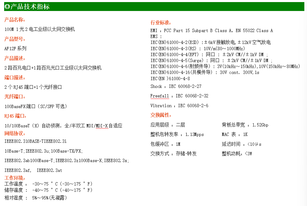 2路百兆電口+1路百兆SC光口工業(yè)級(jí)以太網(wǎng)交換機(jī),支持2個(gè)10Base-T/100Base-TX電口和1個(gè)100Base-X光口。產(chǎn)品符合FCC、CE、ROHS標(biāo)準(zhǔn)。AF12F系列交換機(jī)具有-30℃~75℃的工作溫度,具有超強(qiáng)的堅(jiān)固度能適應(yīng)各種嚴(yán)苛環(huán)境,也可以非常方便的安置在空間緊湊的控制箱中。導(dǎo)軌的安裝特性、寬溫操作及擁有IP40防護(hù)等級(jí)的外殼及LED指示燈,使AF12F成為一個(gè)即插即用的工業(yè)級(jí)設(shè)備,為用戶的以太網(wǎng)設(shè)備聯(lián)網(wǎng)提供可靠、便捷的解決方案。