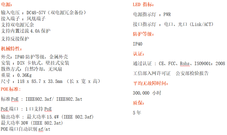 1路千兆POE電口+1路千兆FX光口工業(yè)級以太網(wǎng)POE交換機(jī),支持1個10/100Base-TX電口和1個100Base-X光口。產(chǎn)品符合FCC、CE、ROHS標(biāo)準(zhǔn)。RD11GP系列交換機(jī)具有-40℃~80℃的工作溫度,具有超強(qiáng)的堅固度能適應(yīng)各種嚴(yán)苛環(huán)境,也可以非常方便的安置在空間緊湊的控制箱中。導(dǎo)軌的安裝特性、寬溫操作及擁有IP40防護(hù)等級的外殼及LED指示燈,使RD11GP成為一個即插即用的工業(yè)級設(shè)備,為用戶的以太網(wǎng)設(shè)備聯(lián)網(wǎng)提供可靠、便捷的解決方案。