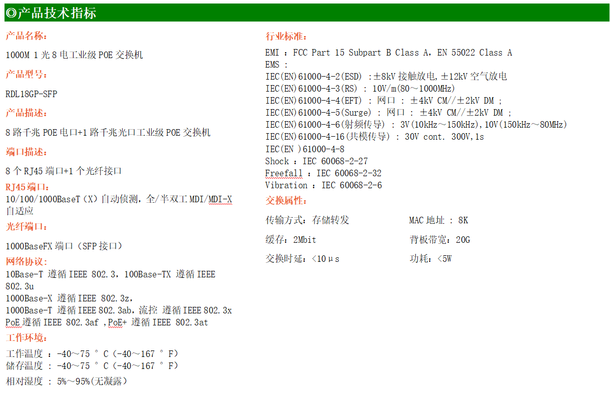 8路千兆POE電口+1路千兆FX光口工業(yè)級(jí)以太網(wǎng)POE交換機(jī),支持8個(gè)10/100/1000Base-TX電口和1個(gè)1000Base-X光口。產(chǎn)品符合FCC、CE、ROHS標(biāo)準(zhǔn)。RDL18GP交換機(jī)具有-40℃~75℃的工作溫度,具有超強(qiáng)的堅(jiān)固度能適應(yīng)各種嚴(yán)苛環(huán)境,也可以非常方便的安置在空間緊湊的控制箱中。導(dǎo)軌的安裝特性、寬溫操作及擁有IP40防護(hù)等級(jí)的外殼及LED指示燈,使RDL18GP成為一個(gè)即插即用的工業(yè)級(jí)設(shè)備,為用戶的以太網(wǎng)設(shè)備聯(lián)網(wǎng)提供可靠、便捷的解決方案。