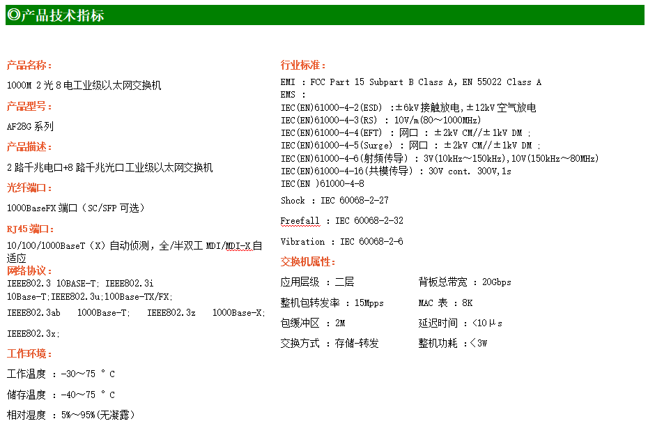 8路千兆電口+2路千兆FX光口工業(yè)級以太網(wǎng)交換機,支持8個100Base-T/1000Base-TX電口和2個1000Base-X光口。產(chǎn)品符合FCC、CE、ROHS標準。AF28G系列交換機具有-30℃~75℃的工作溫度,具有超強的堅固度能適應各種嚴苛環(huán)境,也可以非常方便的安置在空間緊湊的控制箱中。導軌的安裝特性、寬溫操作及擁有IP40防護等級的外殼及LED指示燈,使AF28G成為一個即插即用的工業(yè)級設備,為用戶的以太網(wǎng)設備聯(lián)網(wǎng)提供可靠、便捷的解決方案。