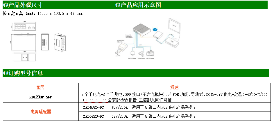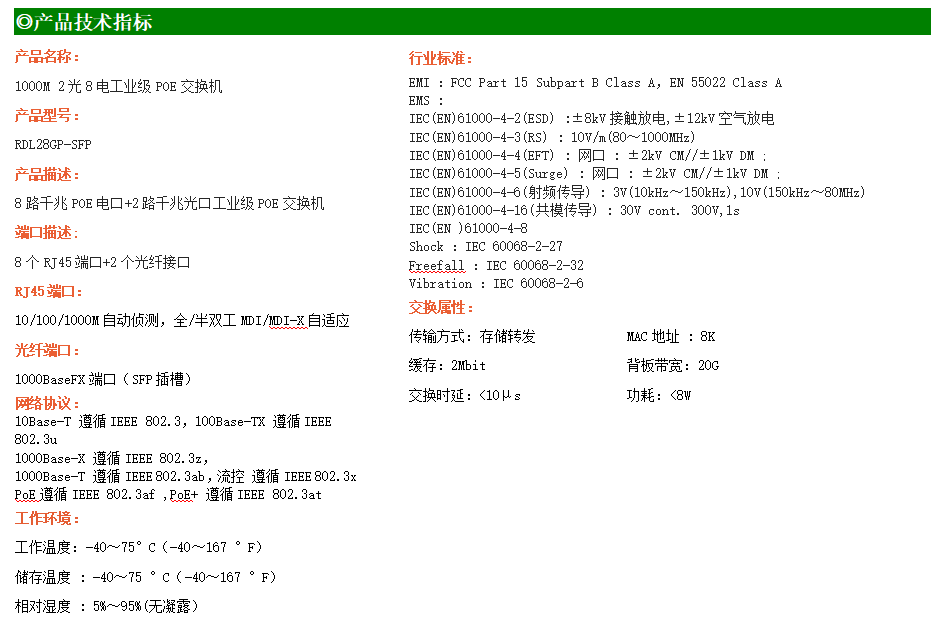 8路千兆POE電口+2路千兆FX光口工業級以太網POE交換機,支持8個10/100/1000Base-TX電口和2個1000Base-X光口。產品符合FCC、CE、ROHS標準。RDL28GP-SFP交換機具有-40℃~75℃的工作溫度,具有超強的堅固度能適應各種嚴苛環境,也可以非常方便的安置在空間緊湊的控制箱中。導軌的安裝特性、寬溫操作及擁有IP40防護等級的外殼及LED指示燈,使RDL28GP-SFP成為一個即插即用的工業級設備,為用戶的以太網設備聯網提供可靠、便捷的解決方案。
