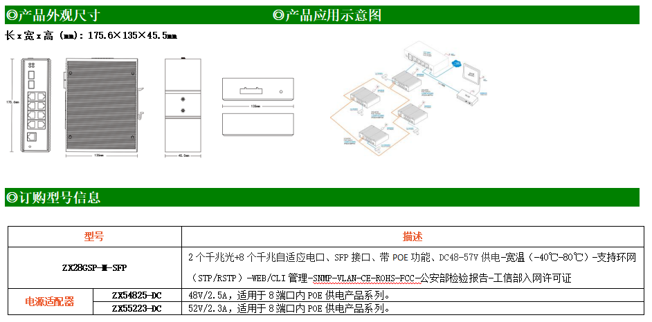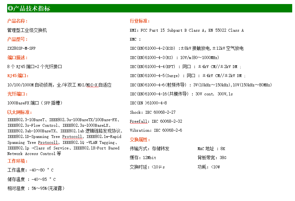 ZX28GSP-M是網(wǎng)管型工業(yè)以太網(wǎng)POE交換機(jī),產(chǎn)品符合FCC、CE、RoHS標(biāo)準(zhǔn)。支持2個千兆光口和8個千兆電口;支持工業(yè)現(xiàn)場所需的以太網(wǎng)二層協(xié)議,保證通信網(wǎng)絡(luò)的穩(wěn)定性;該系列交換機(jī)采用低功耗、無風(fēng)扇設(shè)計,確保無噪聲干擾,同時支持-40~80℃工作溫度和良好的EMC電磁兼容性能,保證在惡劣的工業(yè)環(huán)境中保持穩(wěn)定的工作,為工廠自動化,智能交通,視頻監(jiān)控等工業(yè)應(yīng)用領(lǐng)域組建快速穩(wěn)定的網(wǎng)絡(luò)終端接入網(wǎng)絡(luò)提供安全可靠的解決方案。