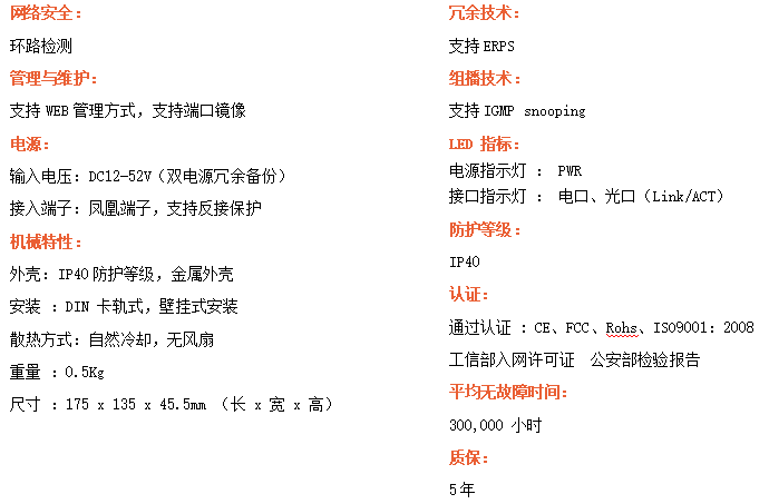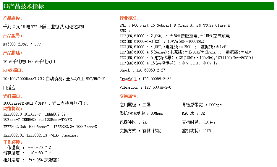 KW5300-216GS-W-SFP系列WEB網管工業級以太網交換機,產品符合FCC、CE、ROHS標準,支持工業現場所需的以太網二層協議,保證通信網絡的穩定性。該系列交換機采用低功耗、無風扇設計,確保無噪聲干擾,同時支持-30~70℃工作溫度和良好的EMC電磁兼容性能,保證在惡劣的工業環境中保持穩定的工作,為工廠自動化,智能交通,視頻監控等工業應用領域組建快速穩定的網絡終端接入網絡提供安全可靠的解決方案。