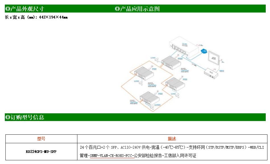 RD224GFSP-MU-AC-SFP是網管型工業以太網PoE交換機,產品符合FCC、CE、RoHS標準??商峁?4個百兆PoE端口,所有PoE端口符合IEEE802.3af/at標準。支持工業現場所需的以太網二層協議,保證通信網絡的穩定性;該系列交換機采用低功耗、無風扇設計,確保無噪聲干擾,同時支持-40~85℃工作溫度和良好的EMC電磁兼容性能,保證在惡劣的工業環境中保持穩定的工作,為工廠自動化,智能交通,視頻監控等工業應用領域組建快速穩定的網絡終端接入網絡提供安全可靠的解決方案。