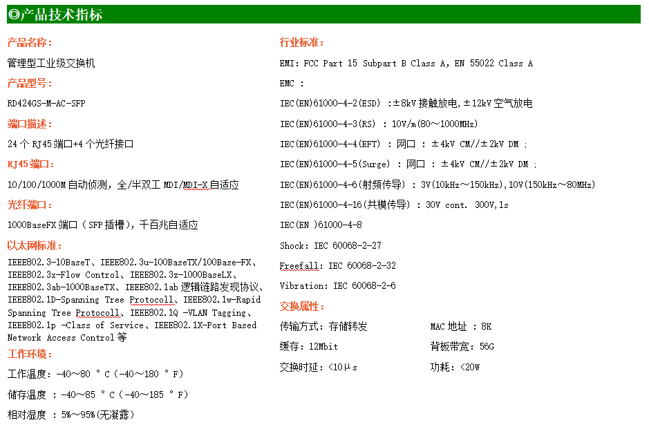 RD424GS-M-AC-SFP是網(wǎng)管型工業(yè)以太網(wǎng)交換機(jī),產(chǎn)品符合FCC、CE、RoHS標(biāo)準(zhǔn)。支持4個(gè)千兆光口和24個(gè)千兆電口;支持工業(yè)現(xiàn)場(chǎng)所需的以太網(wǎng)二層協(xié)議,保證通信網(wǎng)絡(luò)的穩(wěn)定性;該系列交換機(jī)采用低功耗、無(wú)風(fēng)扇設(shè)計(jì),確保無(wú)噪聲干擾,同時(shí)支持-40~80℃工作溫度和良好的EMC電磁兼容性能,保證在惡劣的工業(yè)環(huán)境中保持穩(wěn)定的工作,為工廠自動(dòng)化,智能交通,視頻監(jiān)控等工業(yè)應(yīng)用領(lǐng)域組建快速穩(wěn)定的網(wǎng)絡(luò)終端接入網(wǎng)絡(luò)提供安全可靠的解決方案。