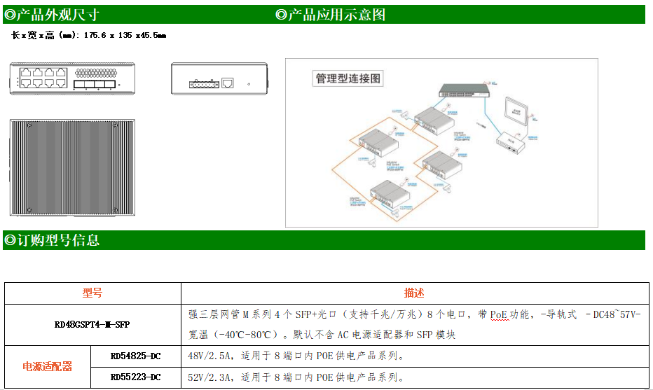 RD48GSPT4-M-SFP交換機是我司推出的一款萬兆三層工業級PoE交換機,配備4個SFP+光口和8個10/100/1000M Base-T自適應電口支持8路PoE,具備先進的硬件處理能力和最豐富的業務特性。支持IPv4/IPv6 硬件雙棧及線速轉發,使客戶能夠從容應對即將帶來的IPv6 時代其提供高容量的交換能力。該系列交換機采用低功耗、無風扇設計,確保無噪聲干擾,同時支持-40~80℃工作溫度和良好的EMC電磁兼容性能,保證在惡劣的工業環境中保持穩定的工作,為工廠自動化,智能交通,視頻監控等工業應用領域組建快速穩定的網絡終端接入網絡提供安全可靠的解決方案。