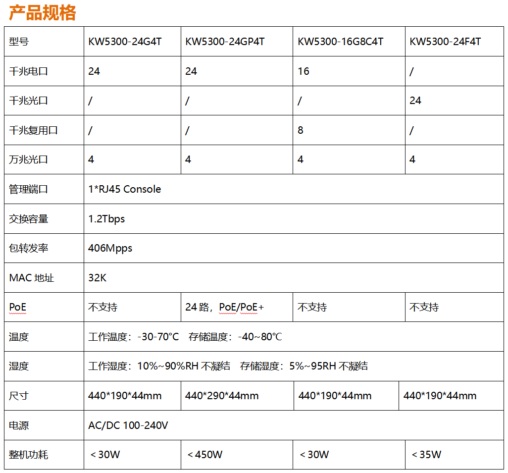 全新開發(fā)推出的KW5300系列全千兆網(wǎng)管寬溫交換機,采用新一代高性能硬件和軟件平臺,提供靈活、高性價比的全千兆接入和上行端口,支持完備的安全防護機制、完善的ACL/QoS策略和靈活的VLAN功能,易于管理維護,滿足用戶對于網(wǎng)絡(luò)設(shè)備易管理、高安全、高性能、低成本的組網(wǎng)需求,專為市政、銀行、教育、醫(yī)院、酒店、網(wǎng)吧、數(shù)據(jù)中心等室內(nèi)項目以及戶外新基建項目定制系列,能滿足大規(guī)模的市場需求。