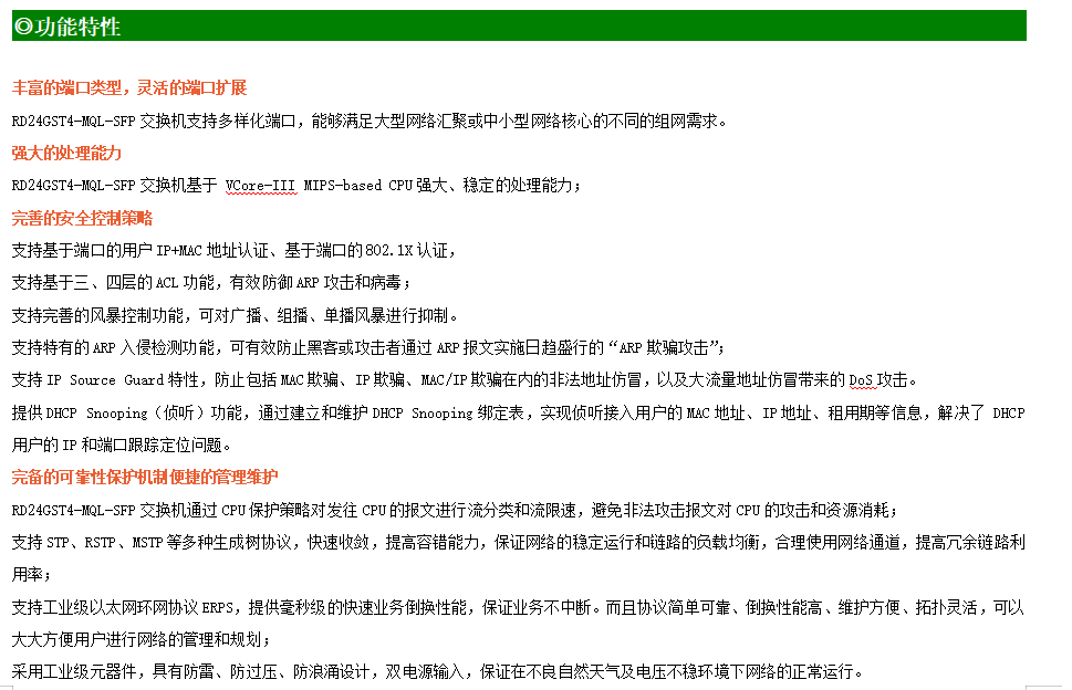 ●網(wǎng)絡(luò)冗余:支持STP/RSTP/MSTP,支持ERPS(自愈時(shí)間<20ms)