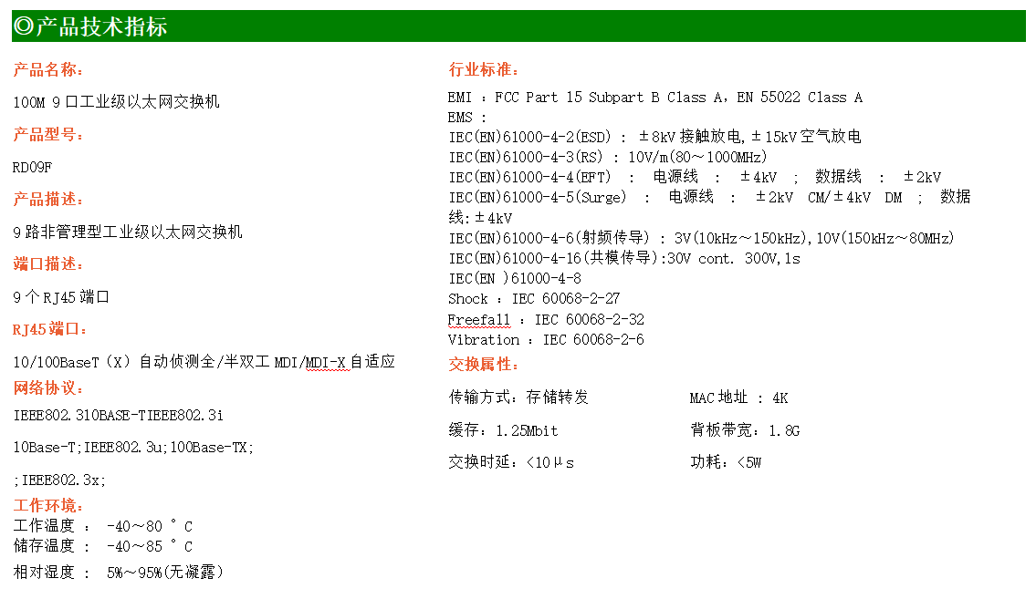 9路百兆電口工業(yè)級(jí)以太網(wǎng)交換機(jī),支持9個(gè)10Base-T/100Base-TX電口。產(chǎn)品符合FCC、CE、ROHS標(biāo)準(zhǔn)。RD09F交換機(jī)具有-40℃~80℃的工作溫度,具有超強(qiáng)的堅(jiān)固度能適應(yīng)各種嚴(yán)苛環(huán)境,也可以非常方便的安置在空間緊湊的控制箱中。導(dǎo)軌的安裝特性、寬溫操作及擁有IP40防護(hù)等級(jí)的外殼及LED指示燈,使RD09F成為一個(gè)即插即用的工業(yè)級(jí)設(shè)備,為用戶的以太網(wǎng)設(shè)備聯(lián)網(wǎng)提供可靠、便捷的解決方案。
