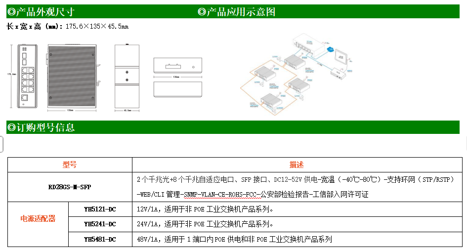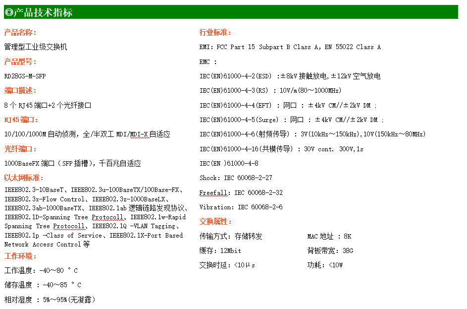 RD28GS-M是網(wǎng)管型工業(yè)以太網(wǎng)交換機(jī),產(chǎn)品符合FCC、CE、RoHS標(biāo)準(zhǔn)。支持2個(gè)千兆光口和8個(gè)千兆電口;支持工業(yè)現(xiàn)場(chǎng)所需的以太網(wǎng)二層協(xié)議,保證通信網(wǎng)絡(luò)的穩(wěn)定性;該系列交換機(jī)采用低功耗、無風(fēng)扇設(shè)計(jì),確保無噪聲干擾,同時(shí)支持-40~80℃工作溫度和良好的EMC電磁兼容性能,保證在惡劣的工業(yè)環(huán)境中保持穩(wěn)定的工作,為工廠自動(dòng)化,智能交通,視頻監(jiān)控等工業(yè)應(yīng)用領(lǐng)域組建快速穩(wěn)定的網(wǎng)絡(luò)終端接入網(wǎng)絡(luò)提供安全可靠的解決方案。