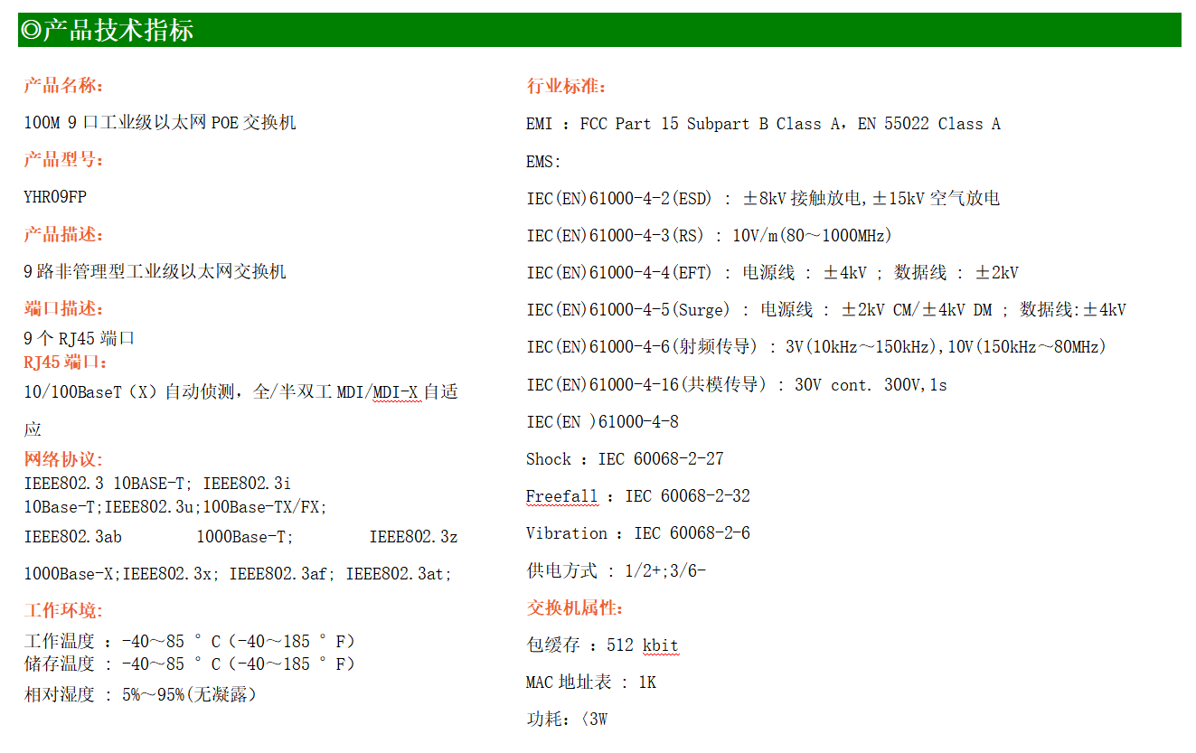 9路百兆電口工業(yè)級(jí)以太網(wǎng)交換機(jī),支持9個(gè)10Base-T/100Base-TX電口。產(chǎn)品符合FCC、CE、ROHS標(biāo)準(zhǔn)。YH200-09FP交換機(jī)具有-40℃~85℃的工作溫度,具有超強(qiáng)的堅(jiān)固度能適應(yīng)各種嚴(yán)苛環(huán)境,也可以非常方便的安置在空間緊湊的控制箱中。導(dǎo)軌的安裝特性、寬溫操作及擁有IP40防護(hù)等級(jí)的外殼及LED指示燈,使YHR09FP成為一個(gè)即插即用的工業(yè)級(jí)設(shè)備,為用戶的以太網(wǎng)設(shè)備聯(lián)網(wǎng)提供可靠、便捷的解決方案。