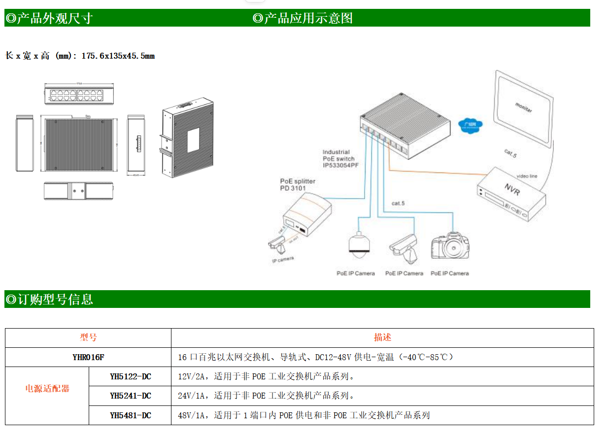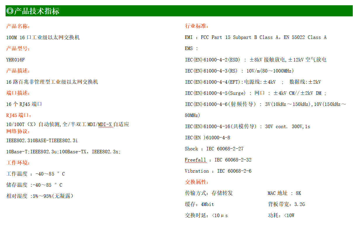 16路百兆電口工業(yè)級以太網(wǎng)交換機,支持16個10Base-T/100Base-TX電口。產(chǎn)品符合FCC、CE、ROHS標準。YHR016F交換機具有-40℃~85℃的工作溫度,具有超強的堅固度能適應各種嚴苛環(huán)境,也可以非常方便的安置在空間緊湊的控制箱中。導軌的安裝特性、寬溫操作及擁有IP40防護等級的外殼及LED指示燈,使YH200-016F成為一個即插即用的工業(yè)級設備,為用戶的以太網(wǎng)設備聯(lián)網(wǎng)提供可靠、便捷的解決方案。