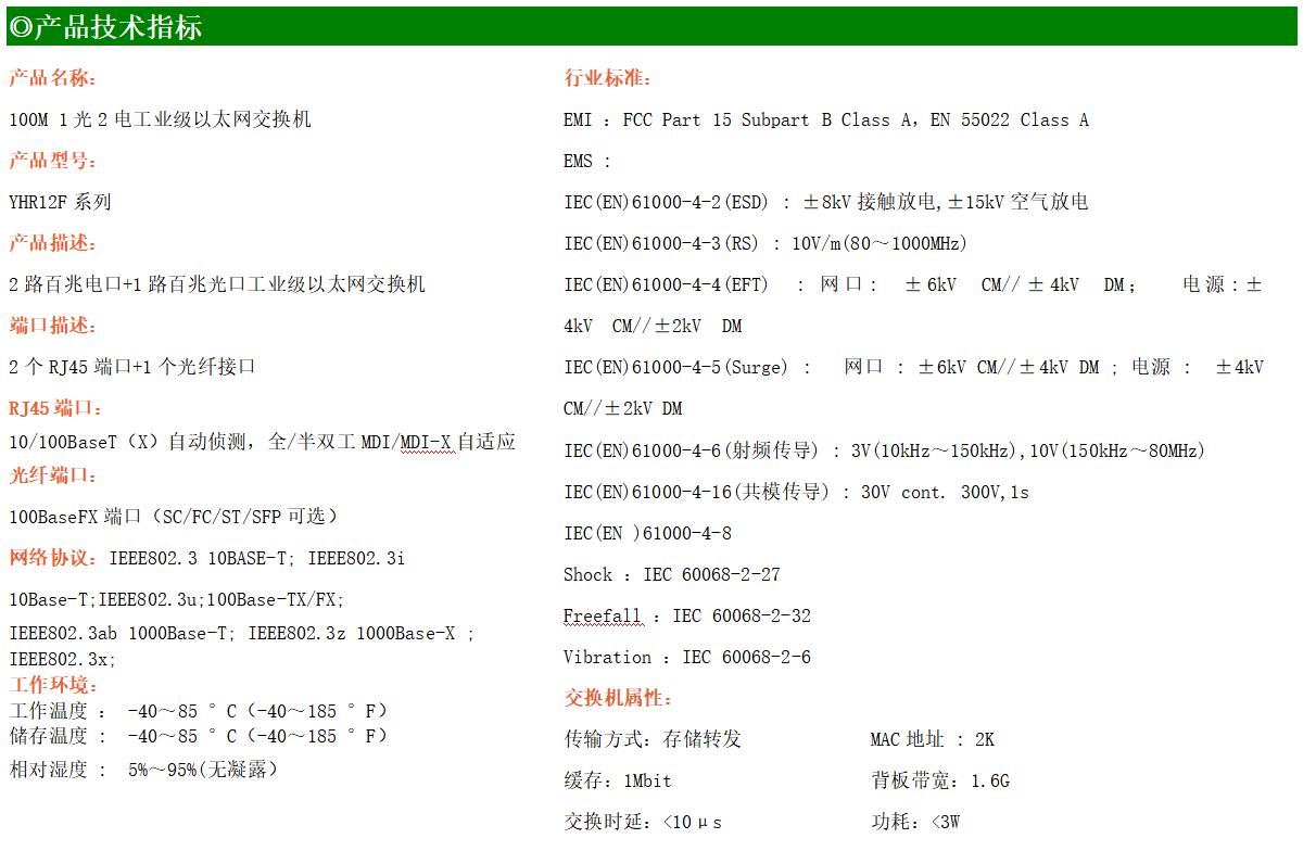 2路百兆電口+1路百兆FX光口工業(yè)級(jí)以太網(wǎng)交換機(jī),支持2個(gè)10Base-T/100Base-TX電口和1個(gè)100Base-X光口。產(chǎn)品符合FCC、CE、ROHS標(biāo)準(zhǔn)。YHR12F系列交換機(jī)具有-40℃~85℃的工作溫度,具有超強(qiáng)的堅(jiān)固度能適應(yīng)各種嚴(yán)苛環(huán)境,也可以非常方便的安置在空間緊湊的控制箱中。導(dǎo)軌的安裝特性、寬溫操作及擁有IP40防護(hù)等級(jí)的外殼及LED指示燈,使YH200-12F成為一個(gè)即插即用的工業(yè)級(jí)設(shè)備,為用戶的以太網(wǎng)設(shè)備聯(lián)網(wǎng)提供可靠、便捷的解決方案。