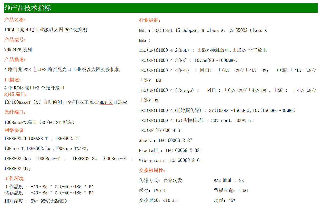 4路百兆POE電口+2路百兆FX光口工業級以太網交換機,支持4個10Base-T/100Base-TX電口和2個100Base-X光口。產品符合FCC、CE、ROHS標準。YH200-24FP系列交換機具有-40℃~85℃的工作溫度,具有超強的堅固度能適應各種嚴苛環境,也可以非常方便的安置在空間緊湊的控制箱中。導軌的安裝特性、寬溫操作及擁有IP40防護等級的外殼及LED指示燈,使YH200-24FP成為一個即插即用的工業級設備,為用戶的以太網設備聯網提供可靠、便捷的解決方案。