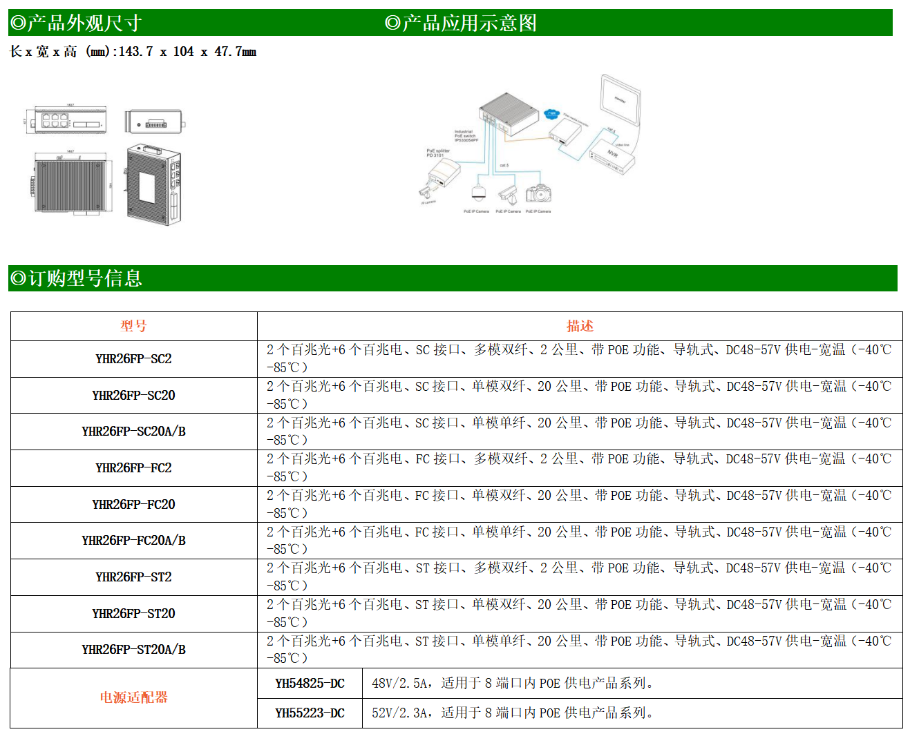 6路百兆POE電口+2路百兆FX光口工業級以太網交換機,支持6個10Base-T/100Base-TX電口和2個100Base-X光口。產品符合FCC、CE、ROHS標準。YH200-26FP系列交換機具有-40℃~85℃的工作溫度,具有超強的堅固度能適應各種嚴苛環境,也可以非常方便的安置在空間緊湊的控制箱中。導軌的安裝特性、寬溫操作及擁有IP40防護等級的外殼及LED指示燈,使YH200-26FP成為一個即插即用的工業級設備,為用戶的以太網設備聯網提供可靠、便捷的解決方案。