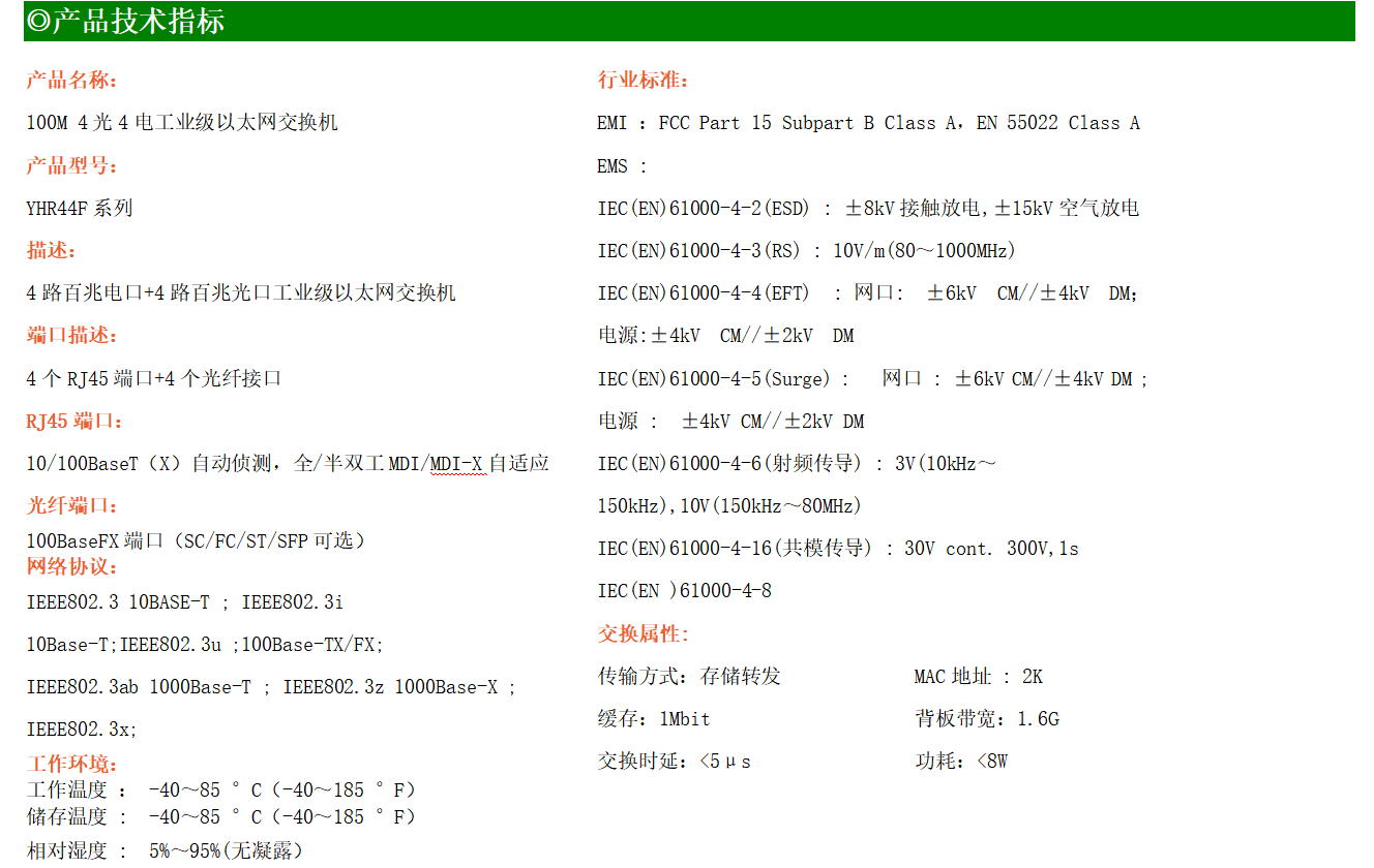 4路百兆電口+4路百兆FX光口工業(yè)級以太網(wǎng)交換機(jī),支持4個10Base-T/100Base-TX電口和4個100Base-X光口。產(chǎn)品符合FCC、CE、ROHS標(biāo)準(zhǔn)。YH200-44F系列交換機(jī)具有-40℃~85℃的工作溫度,具有超強(qiáng)的堅(jiān)固度能適應(yīng)各種嚴(yán)苛環(huán)境,也可以非常方便的安置在空間緊湊的控制箱中。導(dǎo)軌的安裝特性、寬溫操作及擁有IP40防護(hù)等級的外殼及LED指示燈,使YH200-44F成為一個即插即用的工業(yè)級設(shè)備,為用戶的以太網(wǎng)設(shè)備聯(lián)網(wǎng)提供可靠、便捷的解決方案。