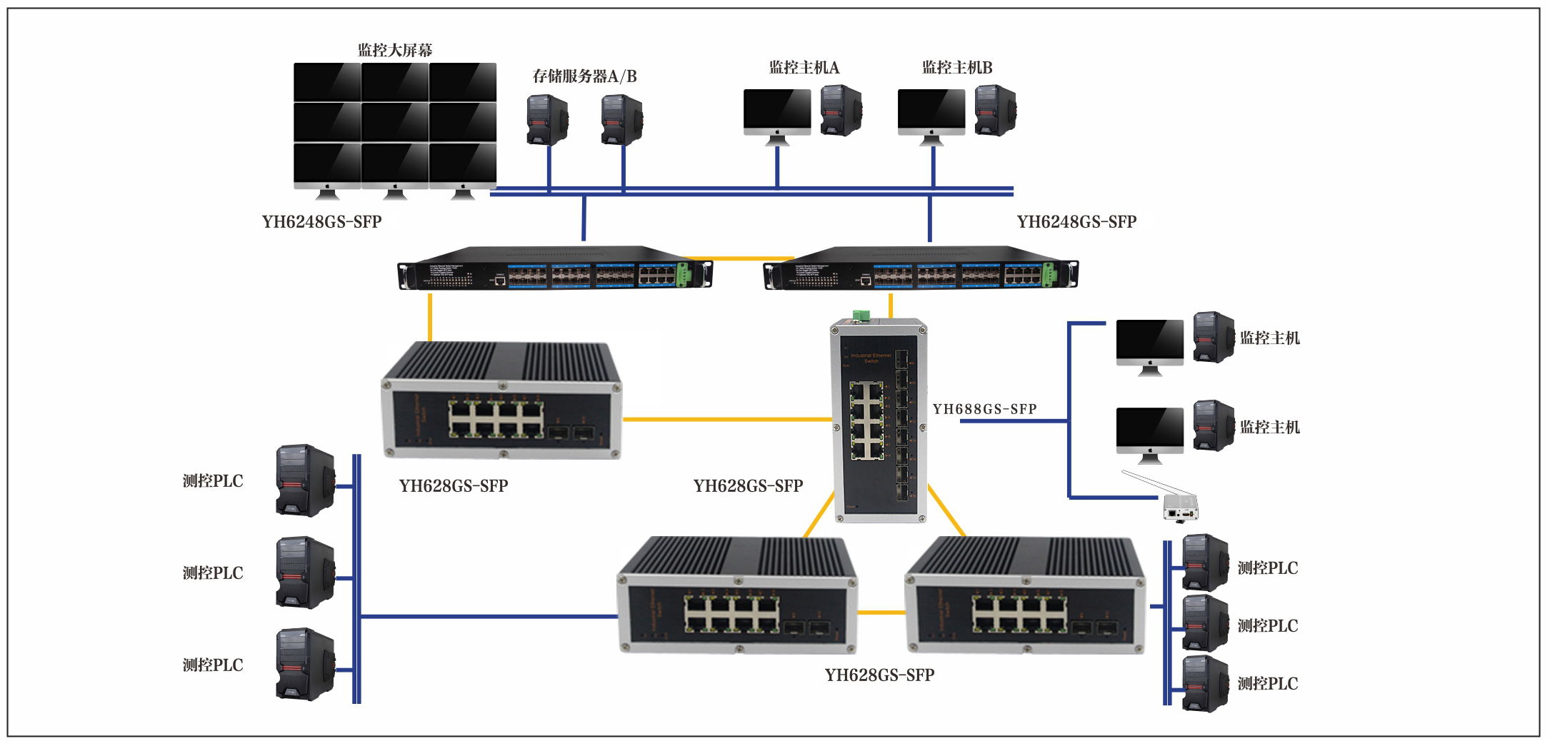宇航在軌道交通設(shè)備監(jiān)控系統(tǒng)解決方案中采用了YH6248G4TS-SFP,YH628GS-SFP,YH688GS-SFP環(huán)境與設(shè)備采集系統(tǒng)通過現(xiàn)場(chǎng)控制器PLC設(shè)備來控制通風(fēng)系統(tǒng),并與空調(diào)系統(tǒng)給排水系統(tǒng),照明系統(tǒng),自動(dòng)扶梯系統(tǒng),導(dǎo)向系統(tǒng),屏蔽門/安全門系統(tǒng),并通過主設(shè)備雙交換機(jī)將數(shù)據(jù)上傳至線路中心控制工作站服務(wù)器監(jiān)控,同時(shí)通過骨干環(huán)網(wǎng)線路上傳至線路中心,BAS控制系統(tǒng)同步監(jiān)控。通過主設(shè)備雙交換機(jī)將BAS工作站及車站服務(wù)器等系統(tǒng)接入設(shè)備與車站骨干網(wǎng)絡(luò)冗余互聯(lián)。 維修與備用中心采用環(huán)網(wǎng)交換機(jī)進(jìn)行環(huán)網(wǎng)冗余連接,線路中心BAS系統(tǒng)采用核心交換機(jī)主設(shè)備連接模式與核心交換機(jī)機(jī)相連。